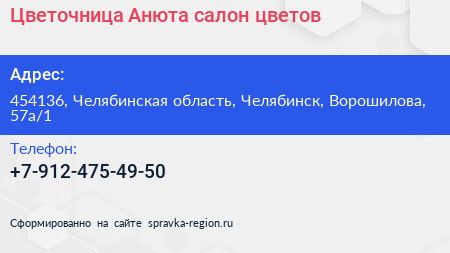 Цветочница Анюта, салон цветов по адресу 454136, Челябинская область, Челябинск, Ворошилова, 57а/1 в дальнейшем Организация, размещена в следующих категориях: