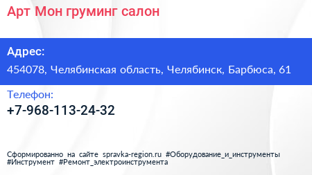 Арт.Мон, груминг-салон по адресу 454078, Челябинская область, Челябинск, Барбюса, 61 в дальнейшем Организация, размещена в следующих категориях: