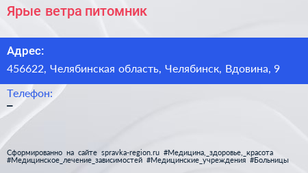 Ярые ветра, питомник по адресу 456622, Челябинская область, Челябинск, Вдовина, 9 в дальнейшем Организация, размещена в следующих категориях: