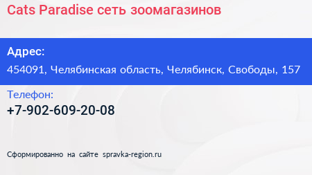 Cats Paradise, сеть зоомагазинов по адресу 454091, Челябинская область, Челябинск, Свободы, 157 в дальнейшем Организация, размещена в следующих категориях: