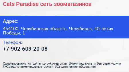 Cats Paradise, сеть зоомагазинов по адресу 454100, Челябинская область, Челябинск, 40-летия Победы, 1 в дальнейшем Организация, размещена в следующих категориях: