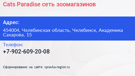 Cats Paradise, сеть зоомагазинов по адресу 454004, Челябинская область, Челябинск, Академика Сахарова, 15 в дальнейшем Организация, размещена в следующих категориях: