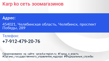 Karp & ko, сеть зоомагазинов по адресу 454021, Челябинская область, Челябинск, проспект Победы, 289 в дальнейшем Организация, размещена в следующих категориях: