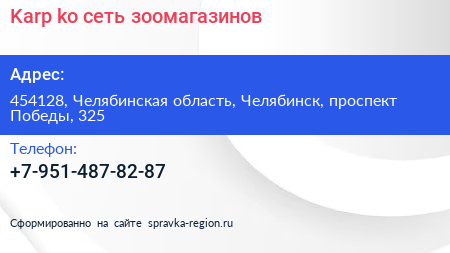 Karp & ko, сеть зоомагазинов по адресу 454128, Челябинская область, Челябинск, проспект Победы, 325 в дальнейшем Организация, размещена в следующих категориях: