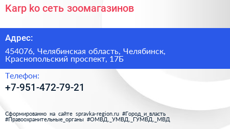 Karp & ko, сеть зоомагазинов по адресу 454076, Челябинская область, Челябинск, Краснопольский проспект, 17Б в дальнейшем Организация, размещена в следующих категориях: