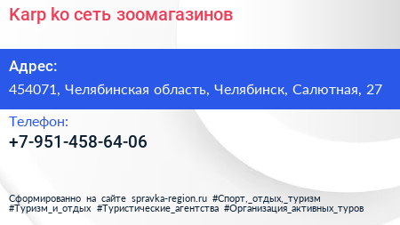 Karp & ko, сеть зоомагазинов по адресу 454071, Челябинская область, Челябинск, Салютная, 27 в дальнейшем Организация, размещена в следующих категориях: