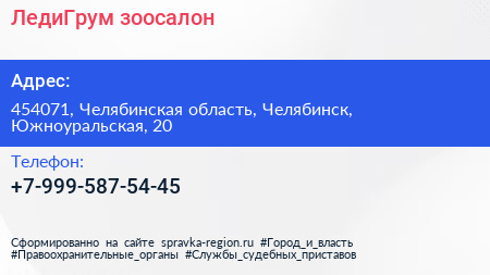 ЛедиГрум, зоосалон по адресу 454071, Челябинская область, Челябинск, Южноуральская, 20 в дальнейшем Организация, размещена в следующих категориях: