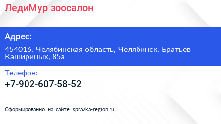 ЛедиМур, зоосалон по адресу 454016, Челябинская область, Челябинск, Братьев Кашириных, 85а в дальнейшем Организация, размещена в следующих категориях: