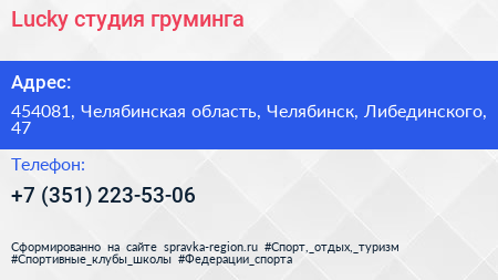 Lucky, студия груминга по адресу 454081, Челябинская область, Челябинск, Либединского, 47 в дальнейшем Организация, размещена в следующих категориях: