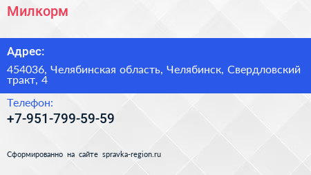 Милкорм по адресу 454036, Челябинская область, Челябинск, Свердловский тракт, 4 в дальнейшем Организация, размещена в следующих категориях: