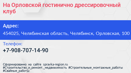 На Орловской, гостинично-дрессировочный клуб по адресу 454025, Челябинская область, Челябинск, Орловская, 100 в дальнейшем Организация, размещена в следующих категориях: