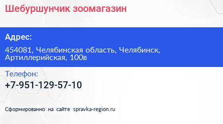 Шебуршунчик, зоомагазин по адресу 454081, Челябинская область, Челябинск, Артиллерийская, 100в в дальнейшем Организация, размещена в следующих категориях: