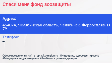 Спаси меня, фонд зоозащиты по адресу 454074, Челябинская область, Челябинск, Ферросплавная, 79 в дальнейшем Организация, размещена в следующих категориях: