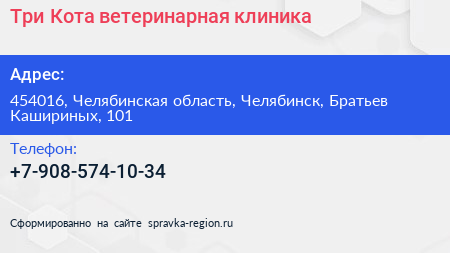Три Кота, ветеринарная клиника по адресу 454016, Челябинская область, Челябинск, Братьев Кашириных, 101 в дальнейшем Организация, размещена в следующих категориях: