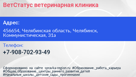 ВетСтатус, ветеринарная клиника по адресу 456654, Челябинская область, Челябинск, Коммунистическая, 31а в дальнейшем Организация, размещена в следующих категориях: