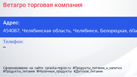 Ветагро, торговая компания по адресу 454087, Челябинская область, Челябинск, Белорецкая, 60а в дальнейшем Организация, размещена в следующих категориях: