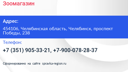 Зоомагазин по адресу 454106, Челябинская область, Челябинск, проспект Победы, 238 в дальнейшем Организация, размещена в следующих категориях: