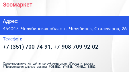 Зоомаркет по адресу 454047, Челябинская область, Челябинск, Сталеваров, 26 в дальнейшем Организация, размещена в следующих категориях: