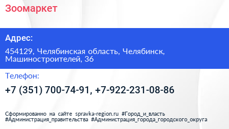 Зоомаркет по адресу 454129, Челябинская область, Челябинск, Машиностроителей, 36 в дальнейшем Организация, размещена в следующих категориях: