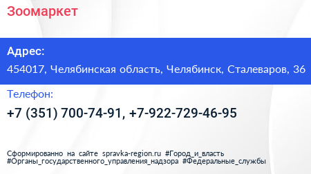Зоомаркет по адресу 454017, Челябинская область, Челябинск, Сталеваров, 36 в дальнейшем Организация, размещена в следующих категориях: