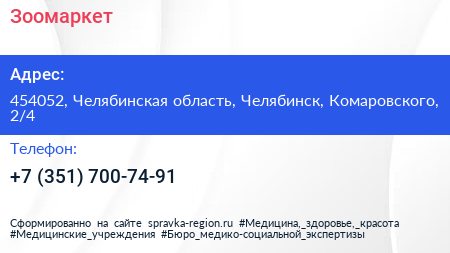 Зоомаркет по адресу 454052, Челябинская область, Челябинск, Комаровского, 2/4 в дальнейшем Организация, размещена в следующих категориях: