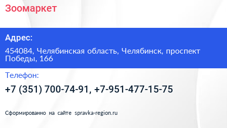 Зоомаркет по адресу 454084, Челябинская область, Челябинск, проспект Победы, 166 в дальнейшем Организация, размещена в следующих категориях:
