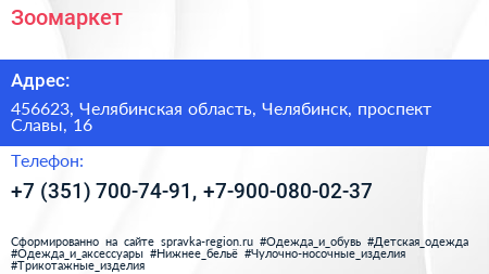 Зоомаркет по адресу 456623, Челябинская область, Челябинск, проспект Славы, 16 в дальнейшем Организация, размещена в следующих категориях: