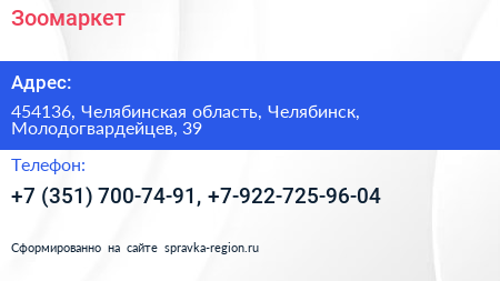 Зоомаркет по адресу 454136, Челябинская область, Челябинск, Молодогвардейцев, 39 в дальнейшем Организация, размещена в следующих категориях: