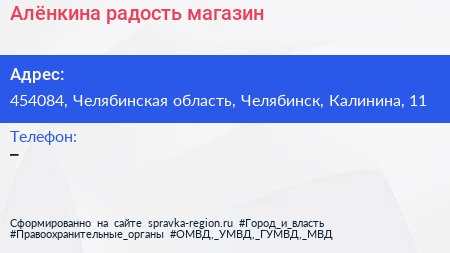Алёнкина радость, магазин по адресу 454084, Челябинская область, Челябинск, Калинина, 11 в дальнейшем Организация, размещена в следующих категориях: