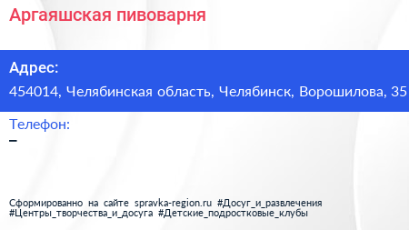 Аргаяшская пивоварня по адресу 454014, Челябинская область, Челябинск, Ворошилова, 35 в дальнейшем Организация, размещена в следующих категориях: