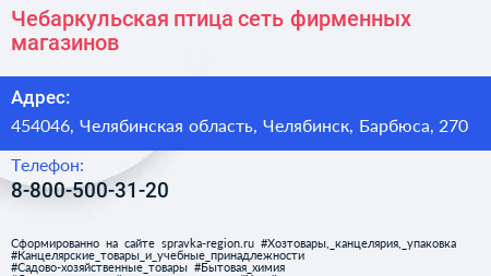 Чебаркульская птица, сеть фирменных магазинов по адресу 454046, Челябинская область, Челябинск, Барбюса, 270 в дальнейшем Организация, размещена в следующих категориях: