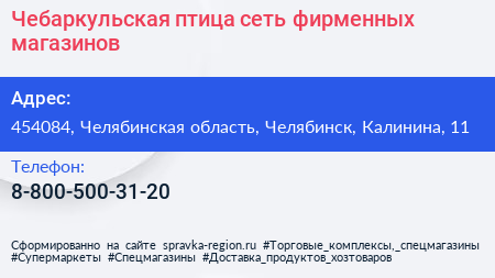 Чебаркульская птица, сеть фирменных магазинов по адресу 454084, Челябинская область, Челябинск, Калинина, 11 в дальнейшем Организация, размещена в следующих категориях: