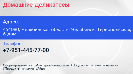 Домашние Деликатесы по адресу 454080, Челябинская область, Челябинск, Тернопольская, 6 дом в дальнейшем Организация, размещена в следующих категориях: