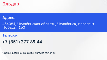 Эльдар по адресу 454084, Челябинская область, Челябинск, проспект Победы, 160 в дальнейшем Организация, размещена в следующих категориях: