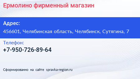Ермолино, фирменный магазин по адресу 456601, Челябинская область, Челябинск, Сутягина, 7 в дальнейшем Организация, размещена в следующих категориях: