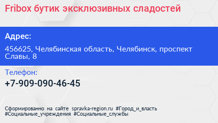 Fribox, бутик эксклюзивных сладостей по адресу 456625, Челябинская область, Челябинск, проспект Славы, 8 в дальнейшем Организация, размещена в следующих категориях: