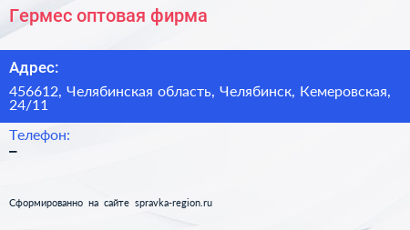 Гермес, оптовая фирма по адресу 456612, Челябинская область, Челябинск, Кемеровская, 24/11 в дальнейшем Организация, размещена в следующих категориях: