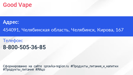 Good Vape по адресу 454091, Челябинская область, Челябинск, Кирова, 167 в дальнейшем Организация, размещена в следующих категориях: