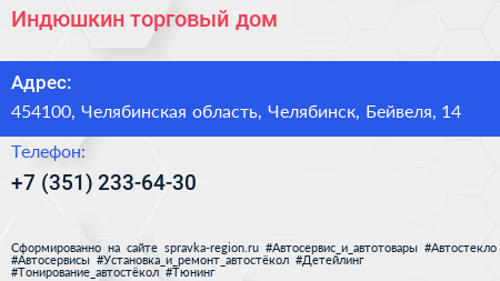 Индюшкин, торговый дом по адресу 454100, Челябинская область, Челябинск, Бейвеля, 14 в дальнейшем Организация, размещена в следующих категориях: