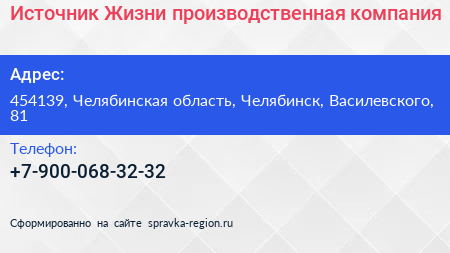 Источник Жизни, производственная компания по адресу 454139, Челябинская область, Челябинск, Василевского, 81 в дальнейшем Организация, размещена в следующих категориях: