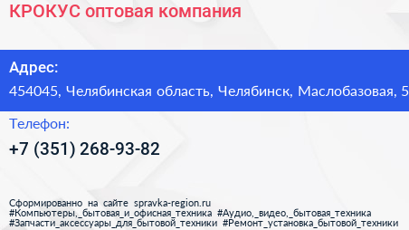 КРОКУС, оптовая компания по адресу 454045, Челябинская область, Челябинск, Маслобазовая, 5 в дальнейшем Организация, размещена в следующих категориях:
