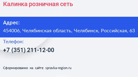Калинка, розничная сеть по адресу 454006, Челябинская область, Челябинск, Российская, 63 в дальнейшем Организация, размещена в следующих категориях: