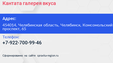 Кантата, галерея вкуса по адресу 454014, Челябинская область, Челябинск, Комсомольский проспект, 65 в дальнейшем Организация, размещена в следующих категориях: