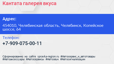 Кантата, галерея вкуса по адресу 454010, Челябинская область, Челябинск, Копейское шоссе, 64 в дальнейшем Организация, размещена в следующих категориях: