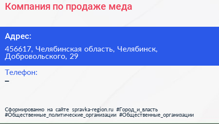 Компания по продаже меда по адресу 456617, Челябинская область, Челябинск, Добровольского, 29 в дальнейшем Организация, размещена в следующих категориях: