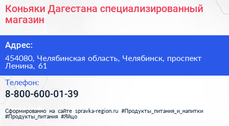 Коньяки Дагестана, специализированный магазин по адресу 454080, Челябинская область, Челябинск, проспект Ленина, 61 в дальнейшем Организация, размещена в следующих категориях: