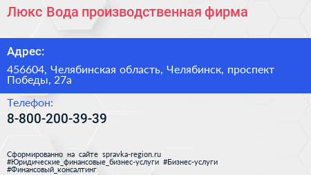 Люкс Вода, производственная фирма по адресу 456604, Челябинская область, Челябинск, проспект Победы, 27а в дальнейшем Организация, размещена в следующих категориях: