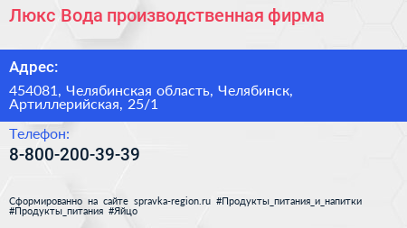 Люкс Вода, производственная фирма по адресу 454081, Челябинская область, Челябинск, Артиллерийская, 25/1 в дальнейшем Организация, размещена в следующих категориях: