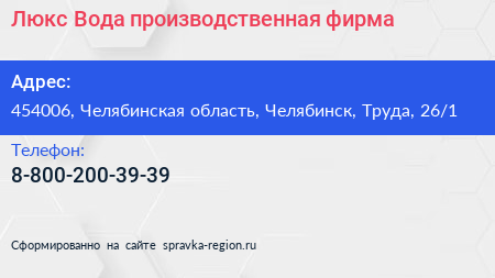 Люкс Вода, производственная фирма по адресу 454006, Челябинская область, Челябинск, Труда, 26/1 в дальнейшем Организация, размещена в следующих категориях: