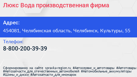 Люкс Вода, производственная фирма по адресу 454081, Челябинская область, Челябинск, Культуры, 55 в дальнейшем Организация, размещена в следующих категориях: